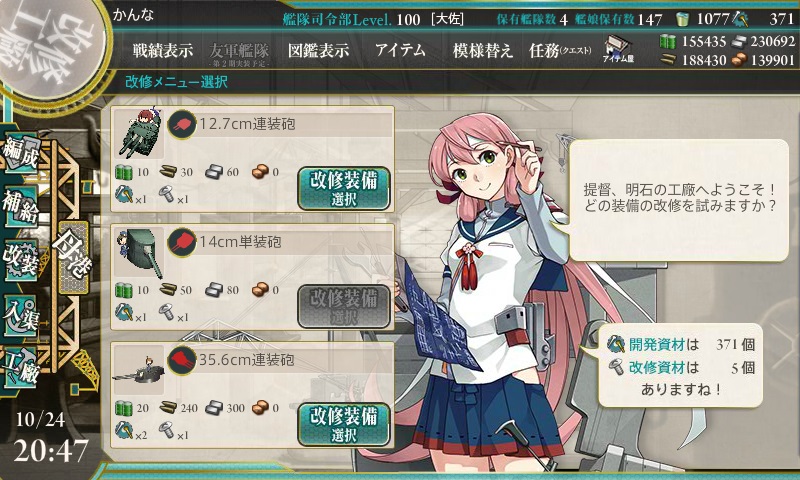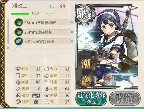 Lv60と、最近の改二に比べると比較的楽に改造できる。