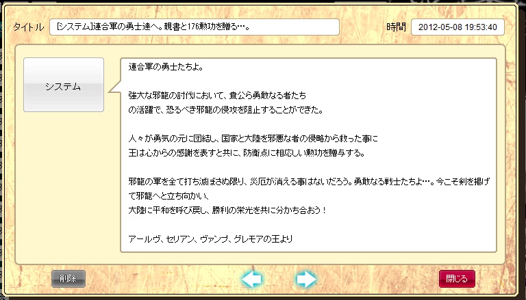 不具合だったらしく、メールで書状と勲功が送られてきた。